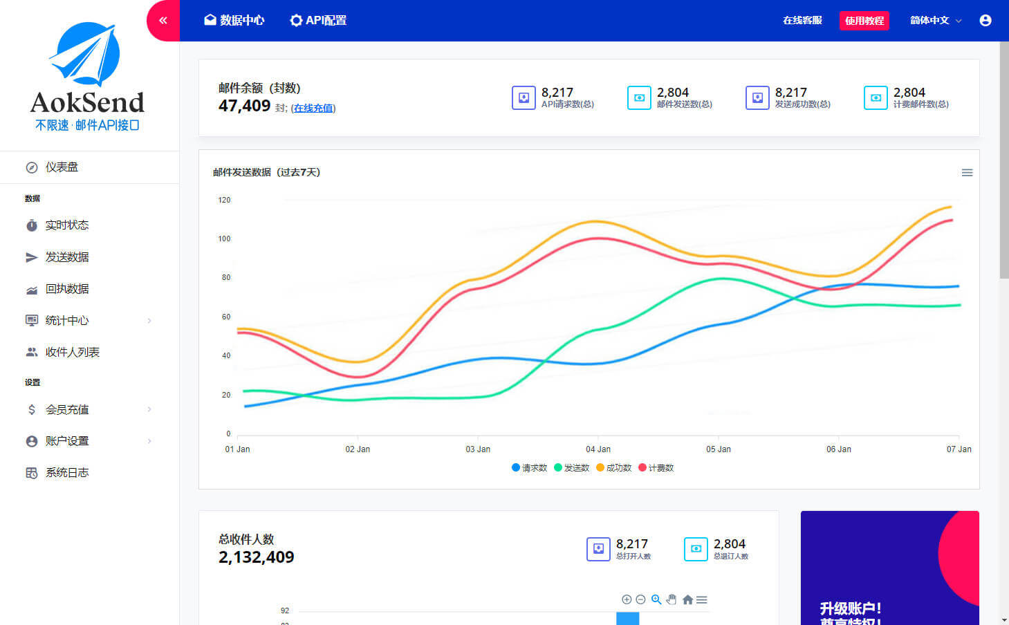 AokSend是一款不限速的郵件API,為客戶提供多種郵件發(fā)送API接口及觸發(fā)式郵件推送服務(wù)。綜合送達率99%、進箱率98%。